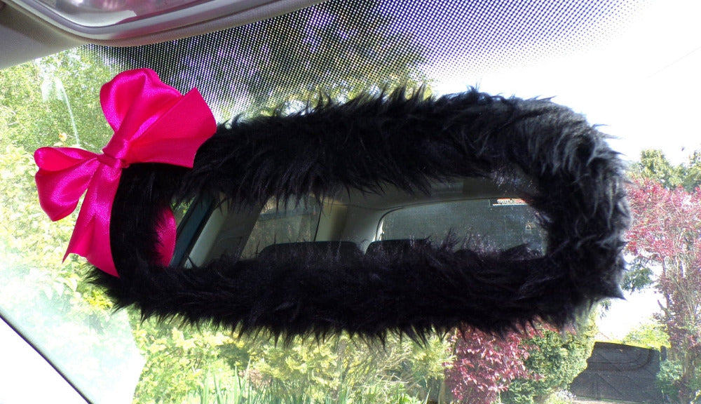 fuzzy Black rear view mirror cover faux fur with Pink satin bow