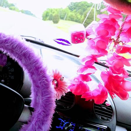 Checkout these pretty lilac seatbelt pads and fuzzy lilac mirror cover